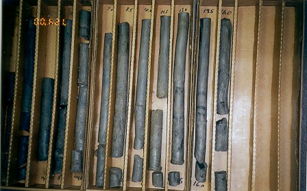 Split-spoon core taken from Route 75 right of way. When split, it reveals typical layering, somewhat deformed by coring operation. Photo, Robert Price. Core courtesy of TN Department of Transportation.
