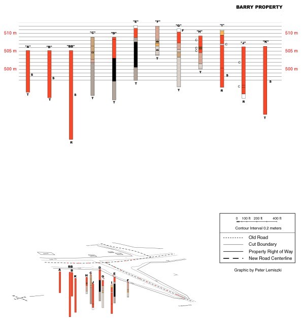 The Tennessee Department of Transportation drilled seventeen holes along the two planned rights of way, and twelve additional on the Barry Property, the remaining part of the hill south of the excavation. They indicated an area perhaps 700 feet long underlain by layered clays. One drill hole indicated the presence of additional dark carbonaceous clay at depth, beneath the thick gray layered horizon.