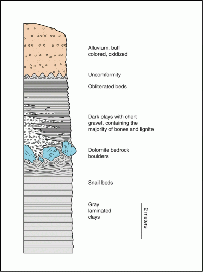 The stratigraphy is complex, and unfortunately, some of it is permanently gone. Most of the vertebrate material seems to lie in the dark layered clay, and dark clay with sand and gravel. These clays contain lenses and layers of angular chert gravel, with clasts of local dolomite. They had gravel beneath them along Route 75, and probably graded laterally into the gravels. Within the lower part of the dark clays are a number of large dolomite blocks. The dark clay and gravels overlie a thick horizon of gray layered clay.