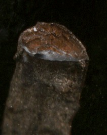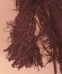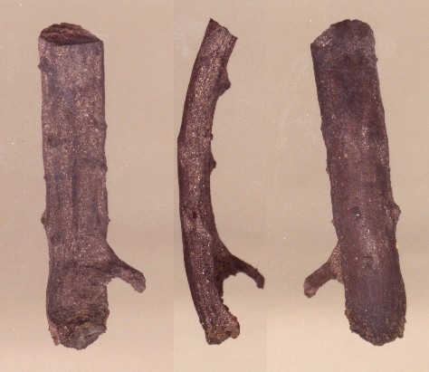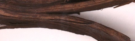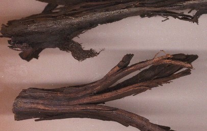 Wood fragments, roughly natural size, curled and split by careless drying (even slowly in a cellar). Fibrous bark, still strong and flexible, suggests cedar or cyprus (x4).